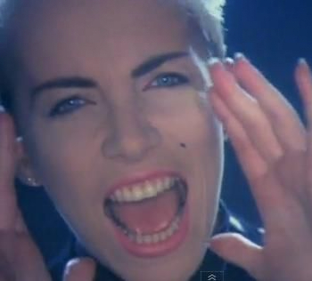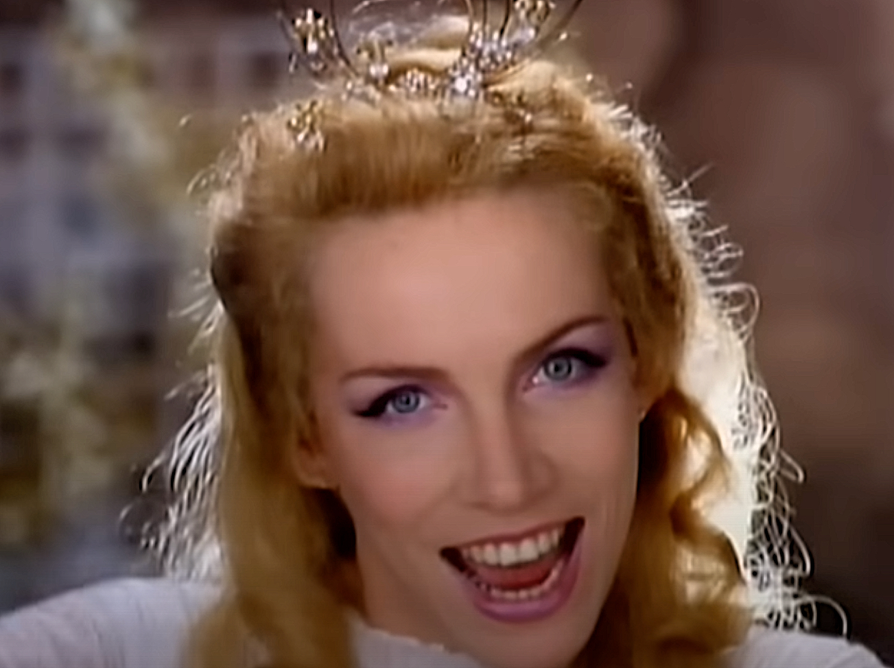 Dave and Annie’s unique video style can be traced back to many art and independent films. The video for the 1985 single “There Must Be An Angel” pays tribute to the opening scene of Ken Russell’s controversial film “The Devils” (1971). The story is set in the court of the Sun King, Louis XIV of France (played by Dave Stewart), and Annie Lennox is the angelic chanteuse brought in to entertain him. For awhile it seems that the King is bored with the performance, but as the song reaches its crescendo he becomes enraptured, and at the end praises the singer, lavishing her with extravagant gifts to show his appreciation. The whimsical video reportedly was supposed to be darker in tone than the finished product, although subtle elements of such can be found upon close inspection. British actor Steven O’Donnell appears as the angel doing backing vocals. The video was filmed at the New Wimbledon Theatre in London on June 21, 1985 in London.